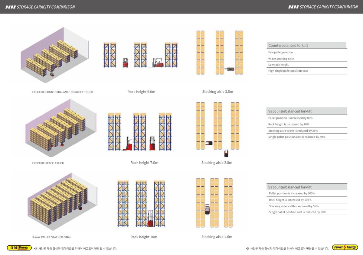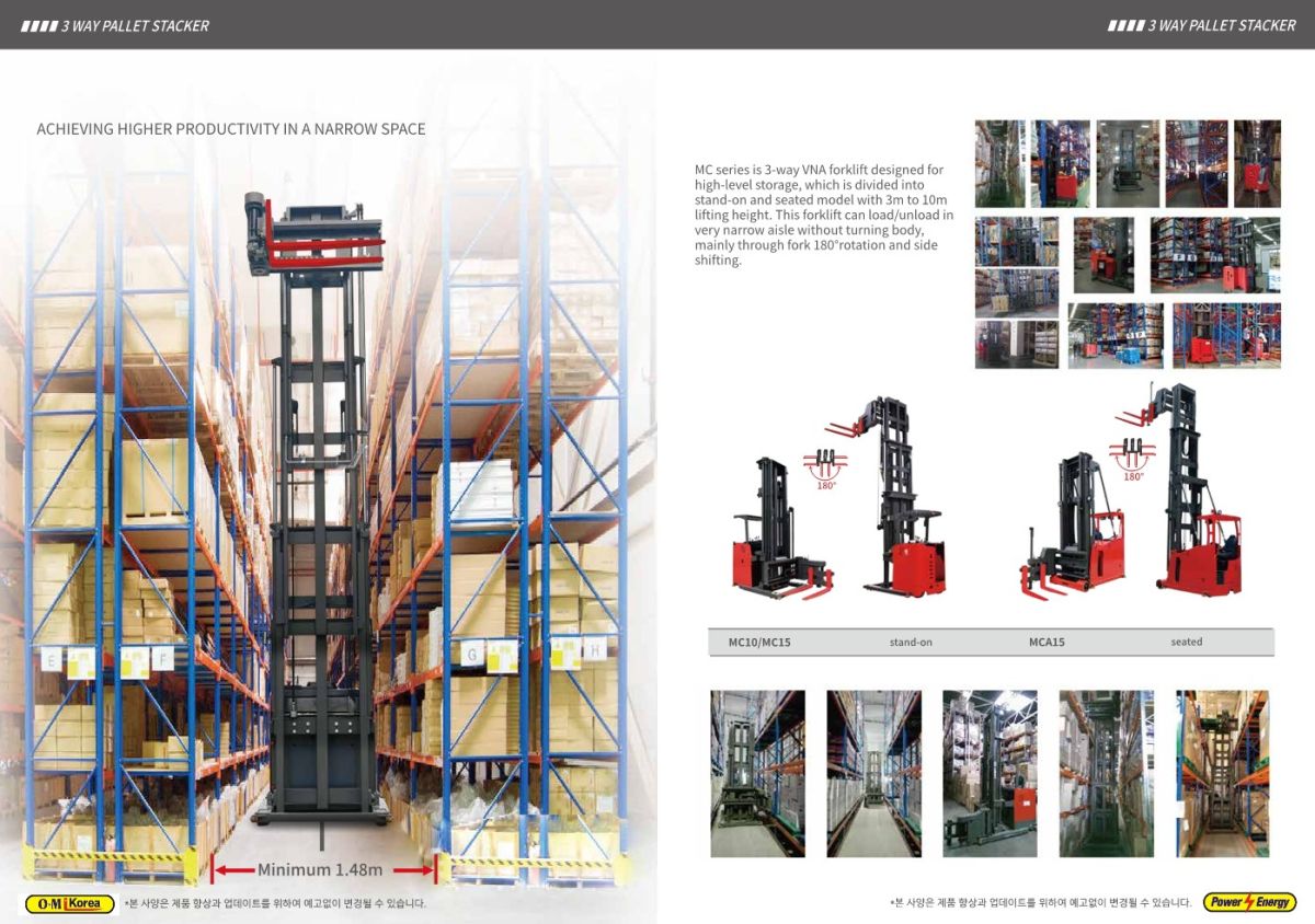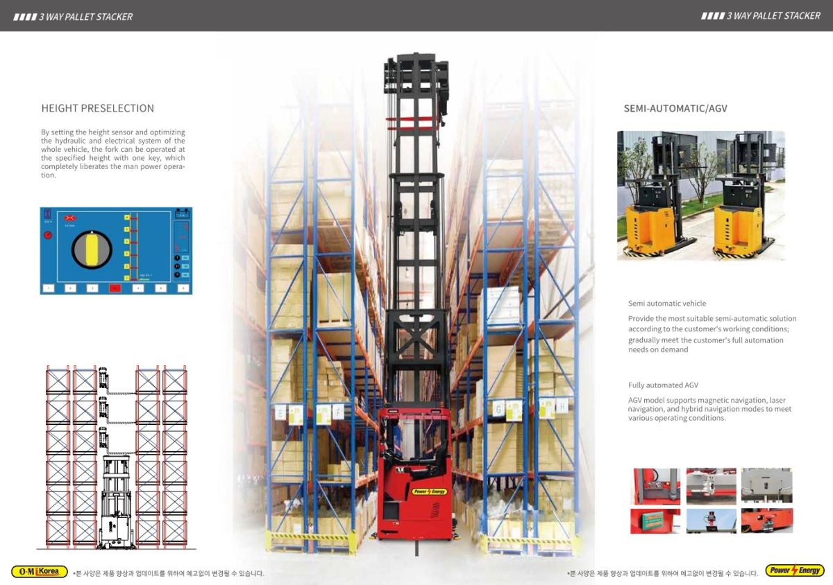 적재된 파렛트를 양쪽 모두 작업가능한 삼방향지게차입니다.