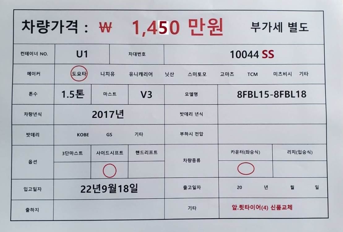장비명도요타 전동지게차 1.5톤 사이드쉬프트