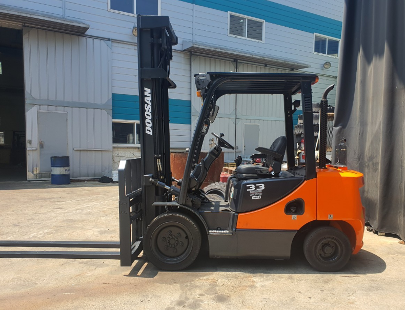 장비명 :  두산 D33SE-7 디젤 3.3톤 3단마스트(4,350mm), 와이드케리지 봉타입 편계식자동발 지게차